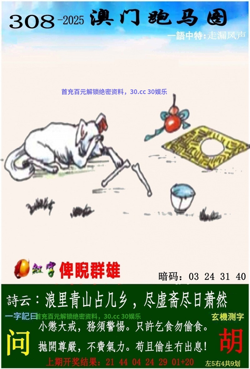 308期一字記曰:【问】 小懲大戒,務須警惕。只許乞食勿偷食。抛開尊嚴,不費氣力。苟且偷生冇出息!【胡】 解:尽虚斋尽日萧然:日萧然解日肖兔龙蛇马羊猴 综合取肖:兔龙蛇马羊猴 |