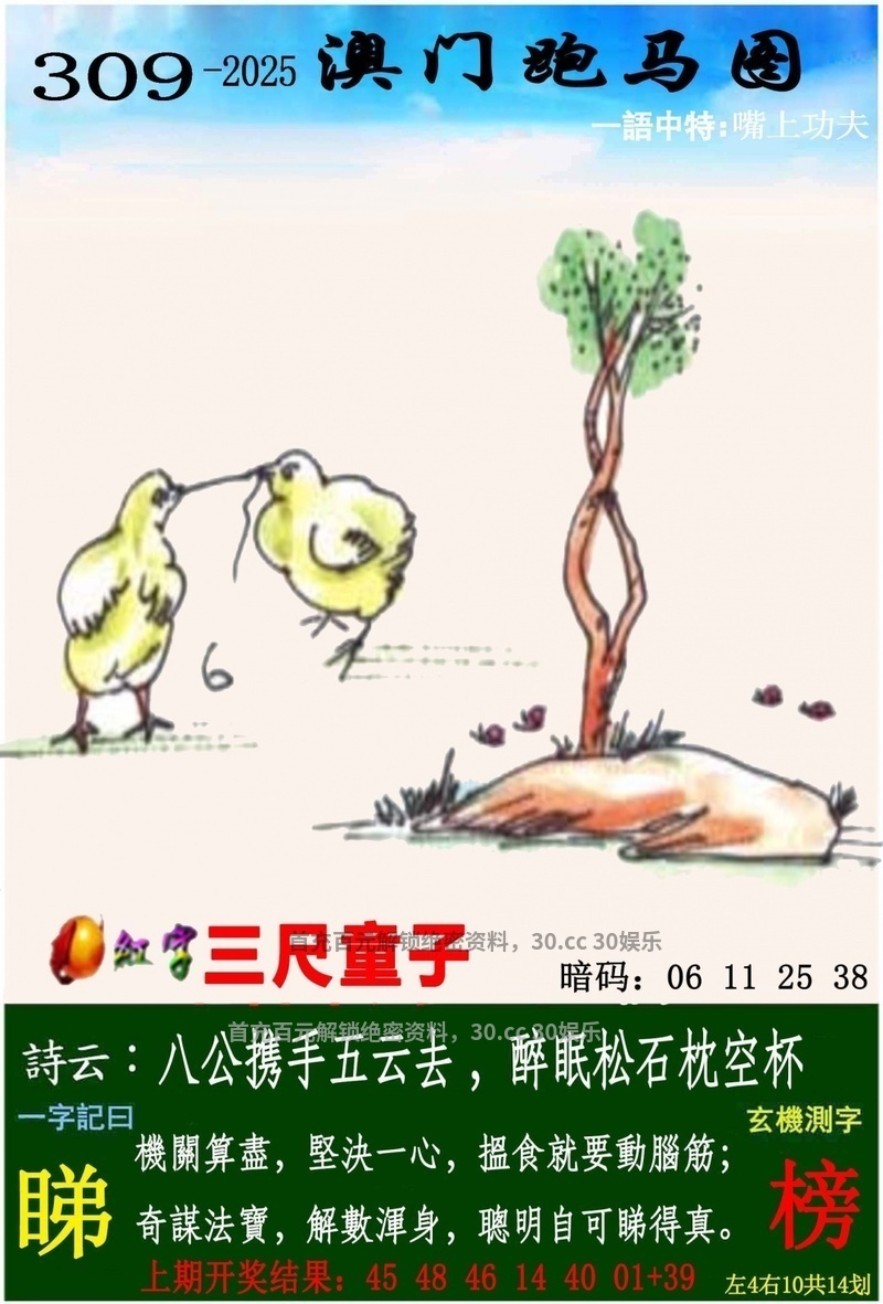 309期一字記曰:【睇】 機關算盡,堅決一心,搵食就要動腦筋;奇謀法寶,解數渾身,聰明自可睇得真。【榜】 解:揾食就要动脑筋解鼠猴蛇猪狗兔 综合取肖:鼠猴蛇猪狗兔 |